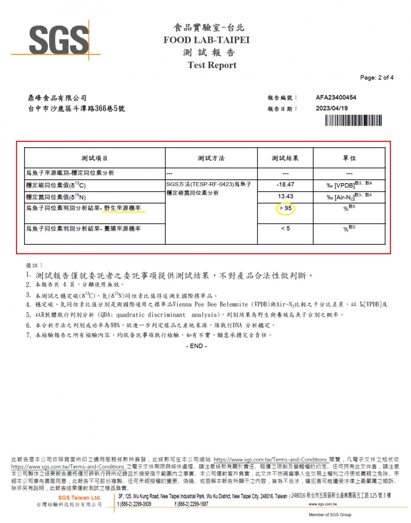 本公司經由SGS檢測野生來源證明,烏魚子同位素判別分析解果